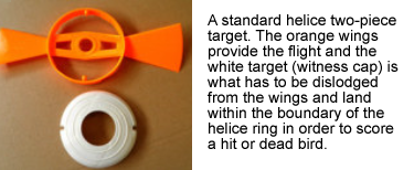 Targets (ZZ Birds): These consist of a central plastic "witness cap" (resembling a clay target) attached to two winged plastic propellers (often orange). The propellers simulate the erratic, unpredictable flight of a live bird.