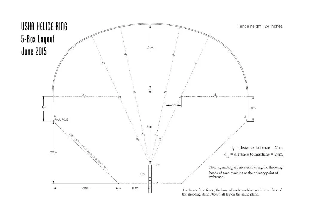 The helice ring, illustrated at above, is where the actual shooting takes place. The ring shown is a typical 5-box (five machine) layout, which is the standard, most commonly-used layout for USHA competitions.