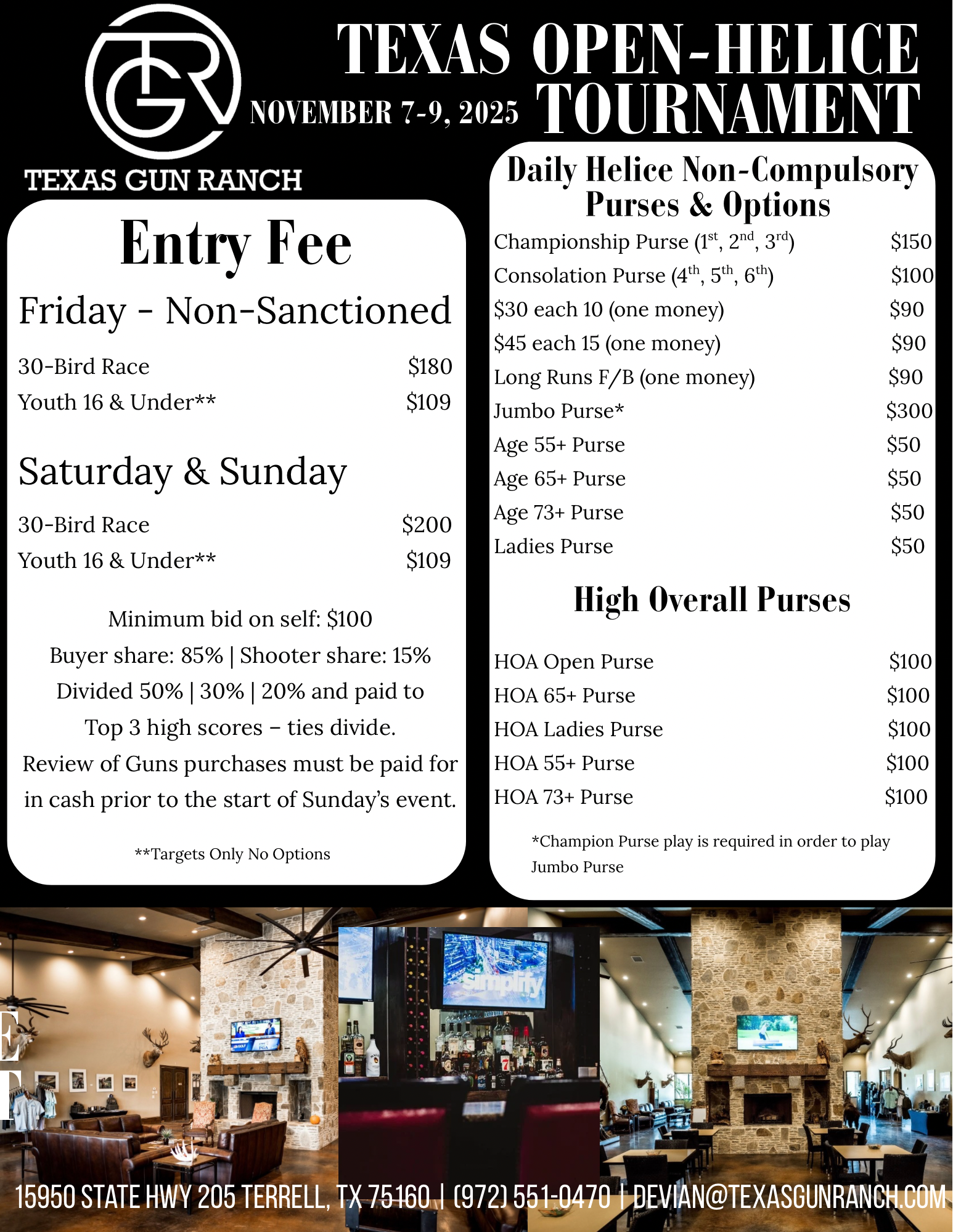 Nov 7 to Nov 9 Texas Open Fri, Nov 7, 2025 10:00 PM Sun, Nov 9, 2025 11:00 AM Texas Gun Ranch (map) Google Calendar ICS View fullsize View fullsize View Event →
