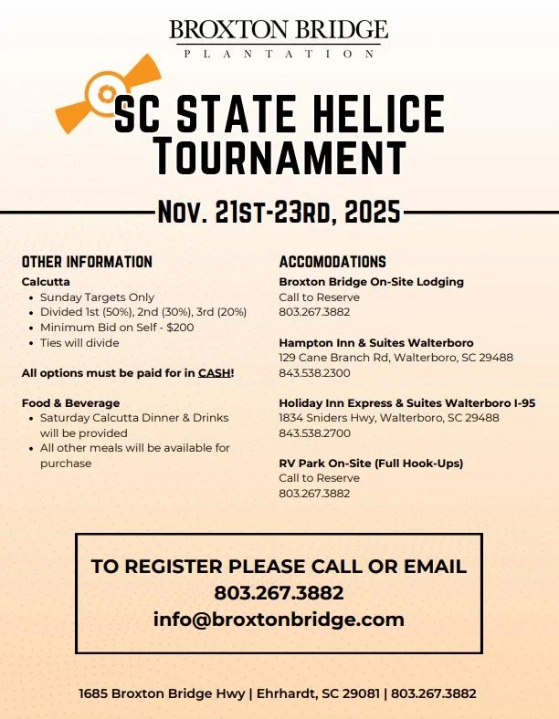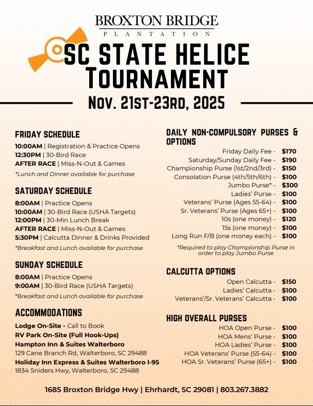 Nov 21 to Nov 23 South Carolina State Championship Fri, Nov 21, 2025 10:00 PM Sun, Nov 23, 2025 11:00 AM Broxton Bridge Plantation (map) Google Calendar ICS Phone: 803-267-3882 View fullsize View fullsize View Event →