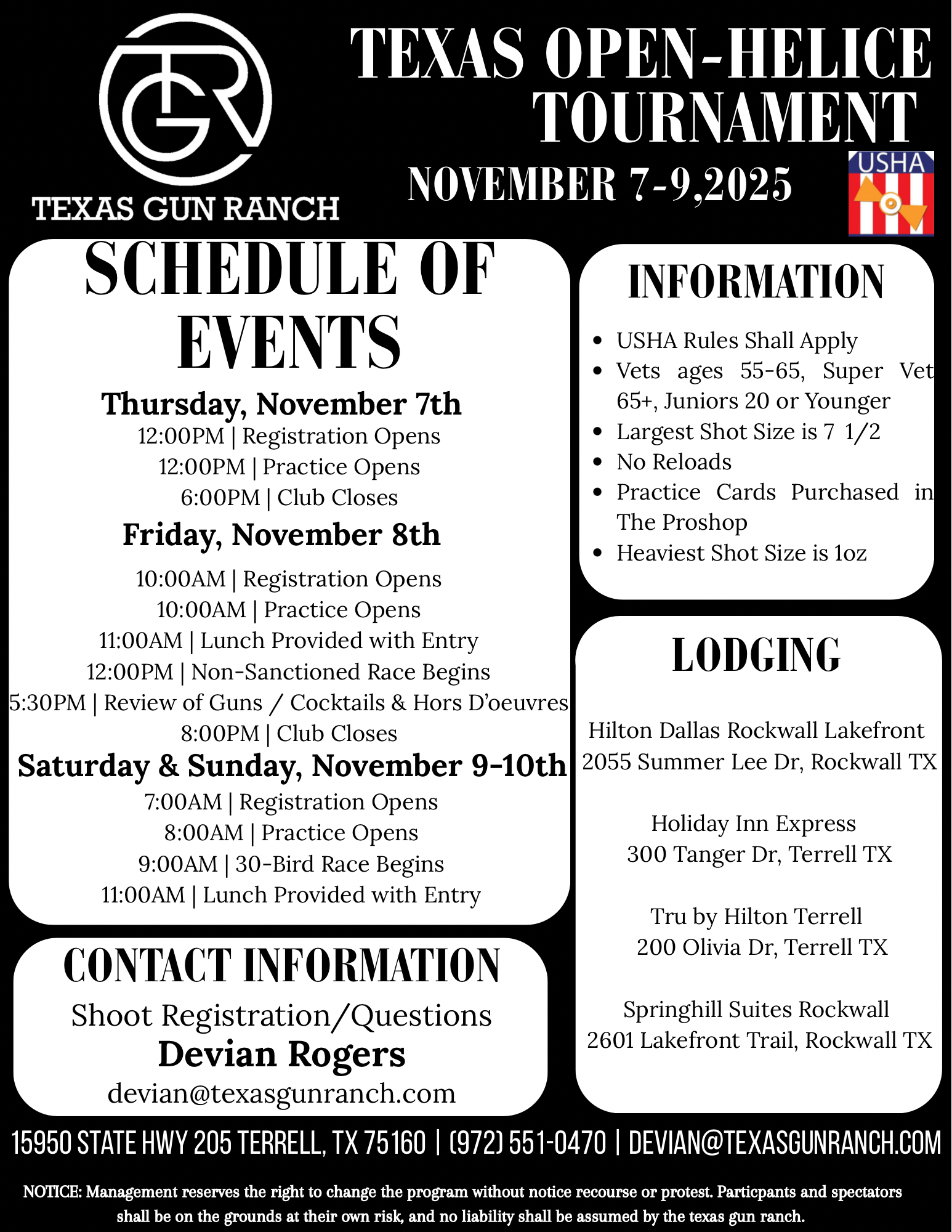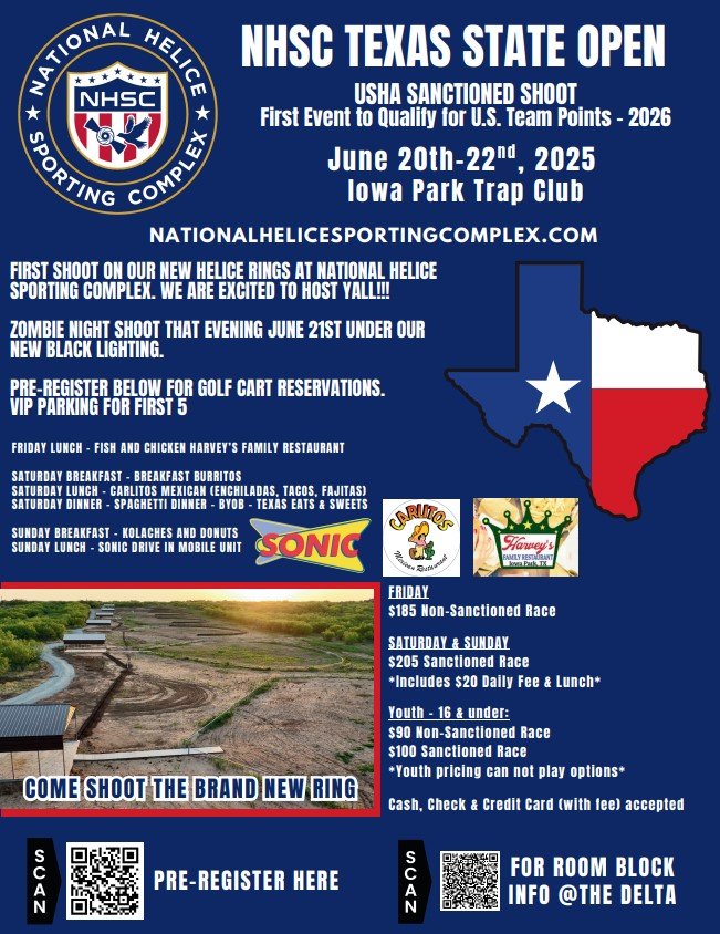 Feb 27 to Mar 1 Providence Hill Farm Fri, Feb 27, 2026 11:30 AM Sun, Mar 1, 2026 12:30 PM Google Calendar ICS Call: 601-924-2014Mail: info@providencehill.comFlyer Coming Soon View Event → Jan 18 to Jan 19 Stockton Trap & Skeet Sun, Jan 18, 2026 10:30 AM Mon, Jan 19, 2026 11:30 AM 4343 North Ashley Lane Stockton, CA, 95215 United States (map) Google Calendar ICS Phone: 209-931-6803Flyer Coming Soon View Event → Nov 21 to Nov 23 South Carolina State Championship Fri, Nov 21, 2025 10:00 PM Sun, Nov 23, 2025 11:00 AM Broxton Bridge Plantation (map) Google Calendar ICS Phone: 803-267-3882 View fullsize View fullsize View Event → Nov 7 to Nov 9 Texas Open Fri, Nov 7, 2025 10:00 PM Sun, Nov 9, 2025 11:00 AM Texas Gun Ranch (map) Google Calendar ICS View fullsize View fullsize View Event → Oct 31 to Nov 2 Providence Hill Farm Fri, Oct 31, 2025 6:00 PM Sun, Nov 2, 2025 7:00 PM Providence Hill Farm (map) Google Calendar ICS View fullsize View fullsize View Event → Jul 11 to Jul 13 Cottonland Gun Club Fri, Jul 11, 2025 11:30 AM Sun, Jul 13, 2025 12:30 PM 235 Riverslane Winnsboro, LA, 71295 United States (map) Google Calendar ICS Call Glynn Kiper @ (318) 366-2194Email: kiperfarms@att.net flyer Saturday Results sunday results View Event → Jun 20 to Jun 22 Texas State Championship Fri, Jun 20, 2025 11:30 AM Sun, Jun 22, 2025 12:30 PM National Helice Sporting Complex (map) Google Calendar ICS Phone: 940-867-3223 Program Saturday Results sunday results View Event →
